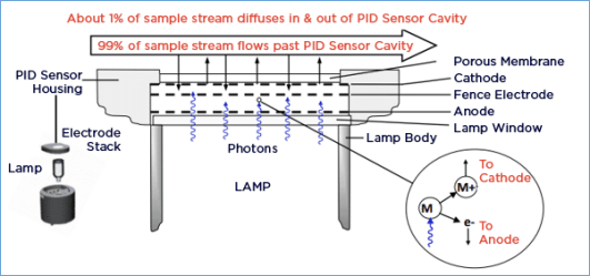 Figure 1 is a schematic of a typical PID sensor system. A UV lamp generates high- energy photons, which pass through the lamp window and a mesh electrode into the sensor chamber. Sample gas is pumped over the sensor and about 1% of it passes through a porous membrane into the other side of the sensor chamber. The inset on the ‘lower right’ of figure 1 shows what happens on a molecular level. When a photon with enough energy strikes a molecule M, an electron (e-) is ejected. M+ ion travels to the cathode and the electron travels to the anode, resulting in a current proportional to the gas concentration. The electrical current is amplified and displayed as a ppm (or part per billion (ppb)) concentration. Not all molecules can be ionized, thus, the major components of clean air, i.e., nitrogen, oxygen, carbon dioxide, argon, etc., do not cause a response, but most VOCs do give a response.